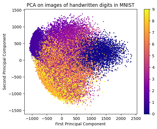 In the above image, we can see how PCA has transformed the original high-dimensional data (28x28 pixel images of handwritten digits) into a lower-dimensional space (2D scatter plot). Each point in the scatter plot represents an image, and the colors indicate the different digit classes. PCA has effectively captured the variance in the data, allowing us to visualize the relationships between different digit classes in a 2D space.