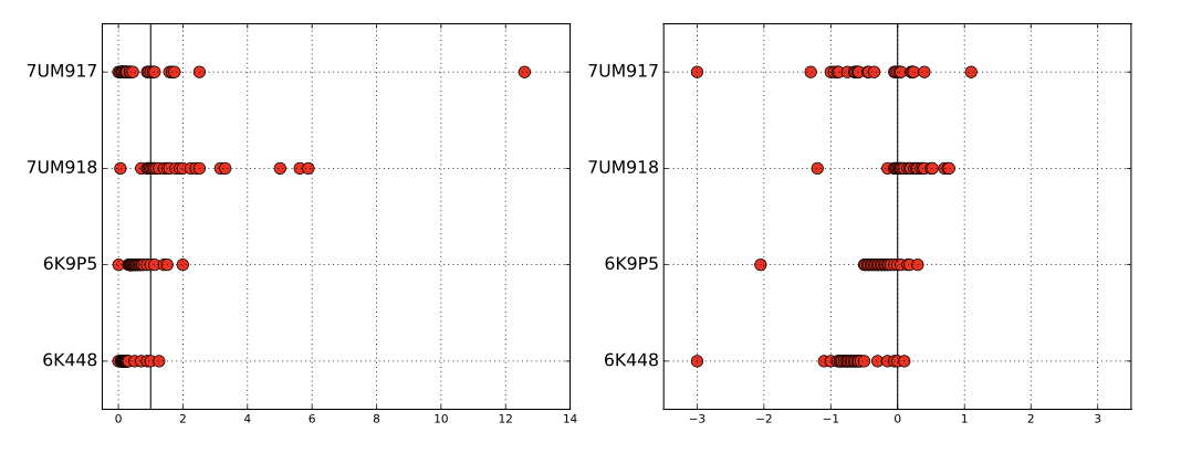 A rookie mistake my students often make involves plotting the value of ratios instead of their logarithms. Figure above (left) is a graph from a student paper, showing the ratio of new score over old score on data over 24 hours (each red dot is the measurement for one hour) on four different data sets (each given a row). The solid black line shows the ratio of one, where both scores give the same result. Now try to read this graph: it isn’t easy because the points on the left side of the line are cramped together in a narrow strip. What jumps out at you are the outliers. Certainly the new algorithm does terrible on 7UM917 in the top row: that point all the way to the right is a real outlier.
