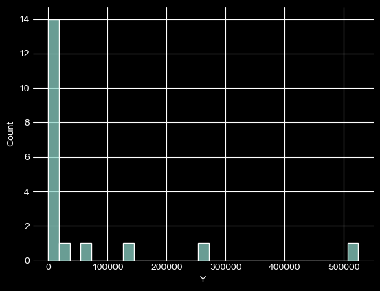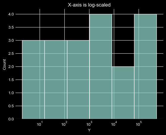 plt.figure()= sns.histplot(data=df, x='Y', log_scale=[True, False]);