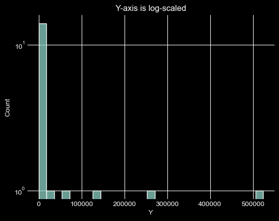 = sns.histplot(data=df, x='Y', log_scale=[False, True]);