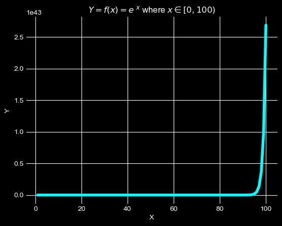 axs set(title="$Y = f(x) = e^{~x}$" + " where " + "$x \in [0, 100)$"); axs.