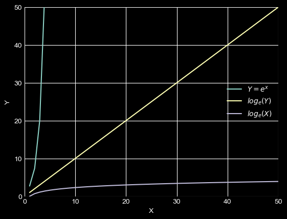 axs =['$Y = e^{x}$', '$log_e(Y)$', '$log_e(X)$']);