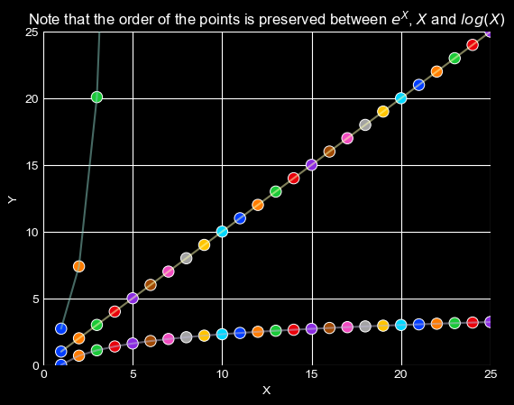 axs.legend([],[], frameonset(title="Note that the order of the points is preserved between $e^X$, $X$ and $log(X)$");