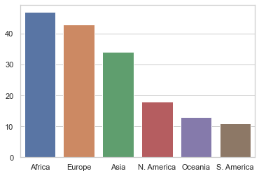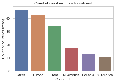ax = sns.barplot(x=val_counts.index, y=val_counts.values);ax.set(xlabel='Continent', ylabel='Count of countries (rows)', title='Count of countries in each continent');