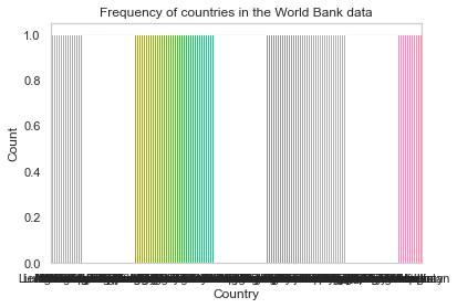 val_counts = data['Country'].value_counts();ax = sns.barplot(x=val_counts.index, y=val_counts.values);ax.set(xlabel='Country', ylabel='Count', title='Frequency of countries in the World Bank data');
