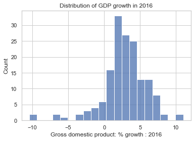 col ="Gross domestic product: % growth : 2016"ax = sns.histplot(data=data, x=col);ax.set(title="Distribution of GDP growth in 2016");