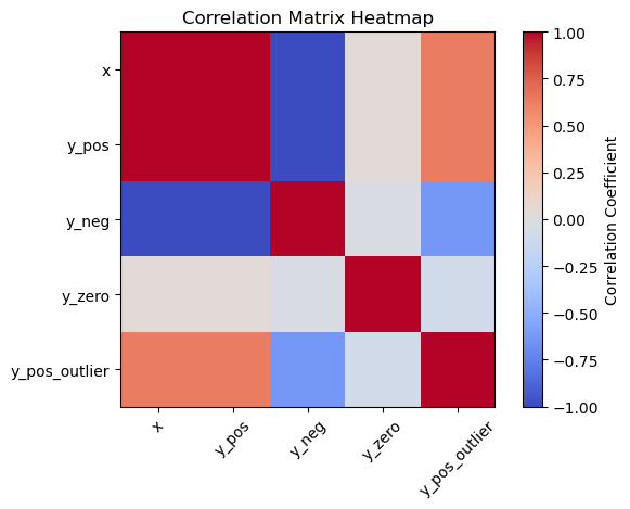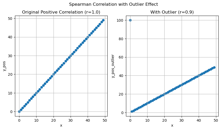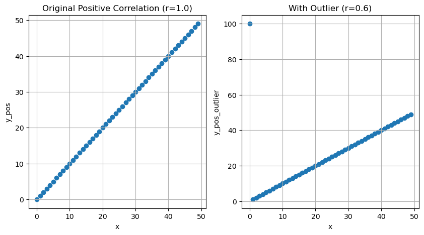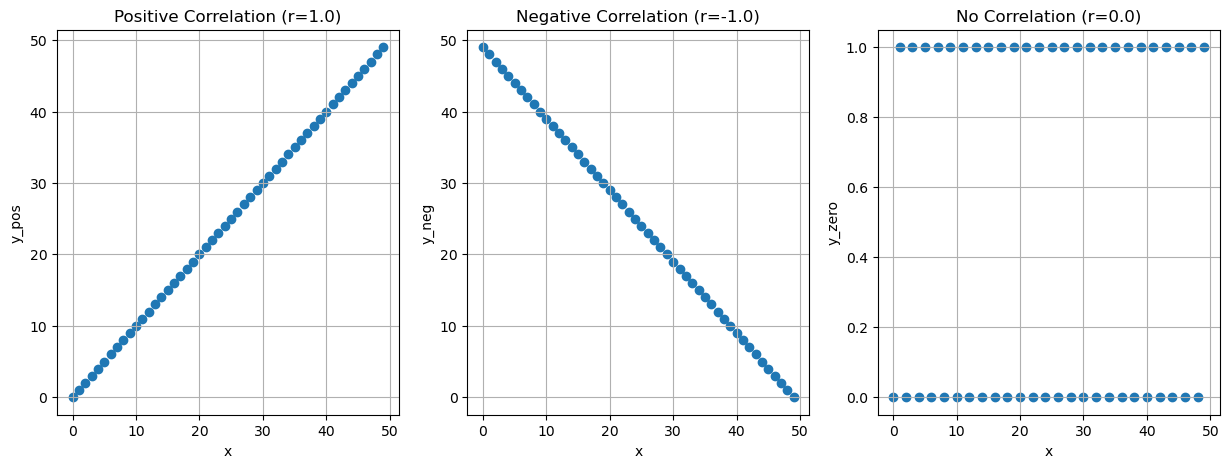 import pandas as pdfrom matplotlib import pyplot as plt n =50df = pd.DataFrame()df['x'] =list(range(n))df['y_pos'] = df['x']df['y_neg'] = df['x'].values[::-1]df['y_zero'] = [0if (i %2==0) else1for i inrange(n)]r_pos = df['x'].corr(df['y_pos'])r_neg = df['x'].corr(df['y_neg'])r_zero = df['x'].corr(df['y_zero'])fig, ax = plt.subplots(1, 3, figsize=(15, 5))ax[0].scatter(df['x'], df['y_pos'])ax[0].set_title(f'Positive Correlation (r={r_pos:.1f})')ax[0].set_xlabel('x')ax[0].set_ylabel('y_pos')ax[0].grid(True)ax[1].scatter(df['x'], df['y_neg'])ax[1].set_title(f'Negative Correlation (r={r_neg:.1f})')ax[1].set_xlabel('x')ax[1].set_ylabel('y_neg')ax[1].grid(True)ax[2].scatter(df['x'], df['y_zero'])ax[2].set_title(f'No Correlation (r={r_zero:.1f})')ax[2].set_xlabel('x')ax[2].set_ylabel('y_zero')ax[2].grid(True)
